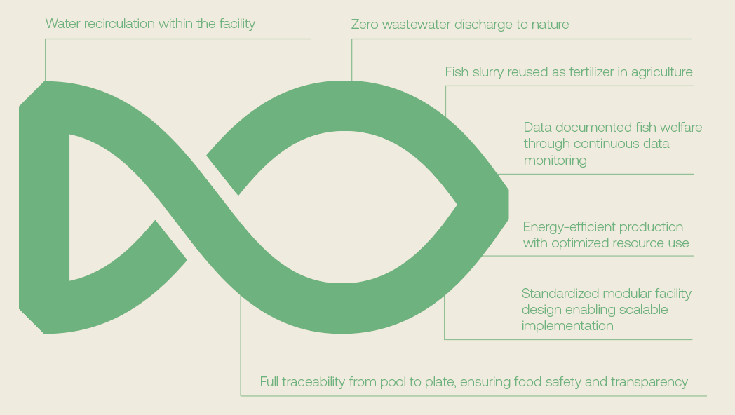 The system is based on advanced recirculating aquaculture technology (RAS), where water is continuously treated and reused.